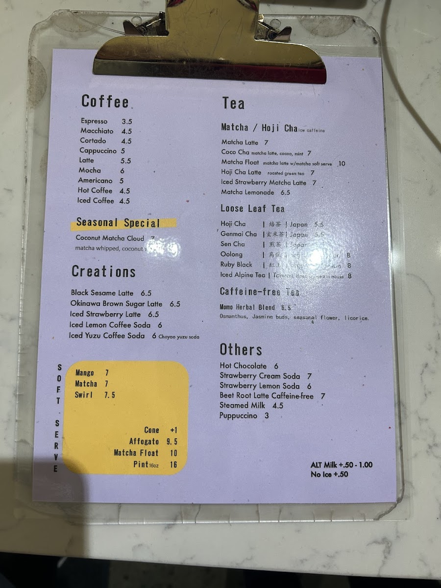 “ I recently visited Momonoki | Momo Cafe with the hopes of getting some work done while trying something new, and it certainly did not disappoint. Upon entering, I was immediately drawn to the beautiful pastries and the impressive drinks the barista was skillfully preparing. Depending on the time of day, it can get a little hectic, and there may be a bit of a wait for drinks, but I didn’t mind at all that day, especially since I was so intrigued by the unique beverages being crafted. The barista recommended a delightful combination of matcha and YUZU, paired with a matcha cookie (*chef’s kiss*). It was absolutely delicious! Afterward, I decided to head upstairs to do some work, where I was treated to a fantastic view of the highway. The upstairs area has limited seating, so I’d recommend arriving early if you want a spot. However, I did experience a bit of disappointment when I got upstairs, as the area wasn’t as clean as I’d hoped. I understand that this space can sometimes be neglected due to the rush of people downstairs waiting for a table, but after mentioning this to a staff member, she promptly took action to tidy up. Her effort to ensure everything was in order made a big difference, and she continued to check on us throughout our visit, bringing water and keeping the space neat. Despite the initial setback, the attentive service and the fantastic food and drinks made it a great experience overall. I'll definitely be returning! ”
